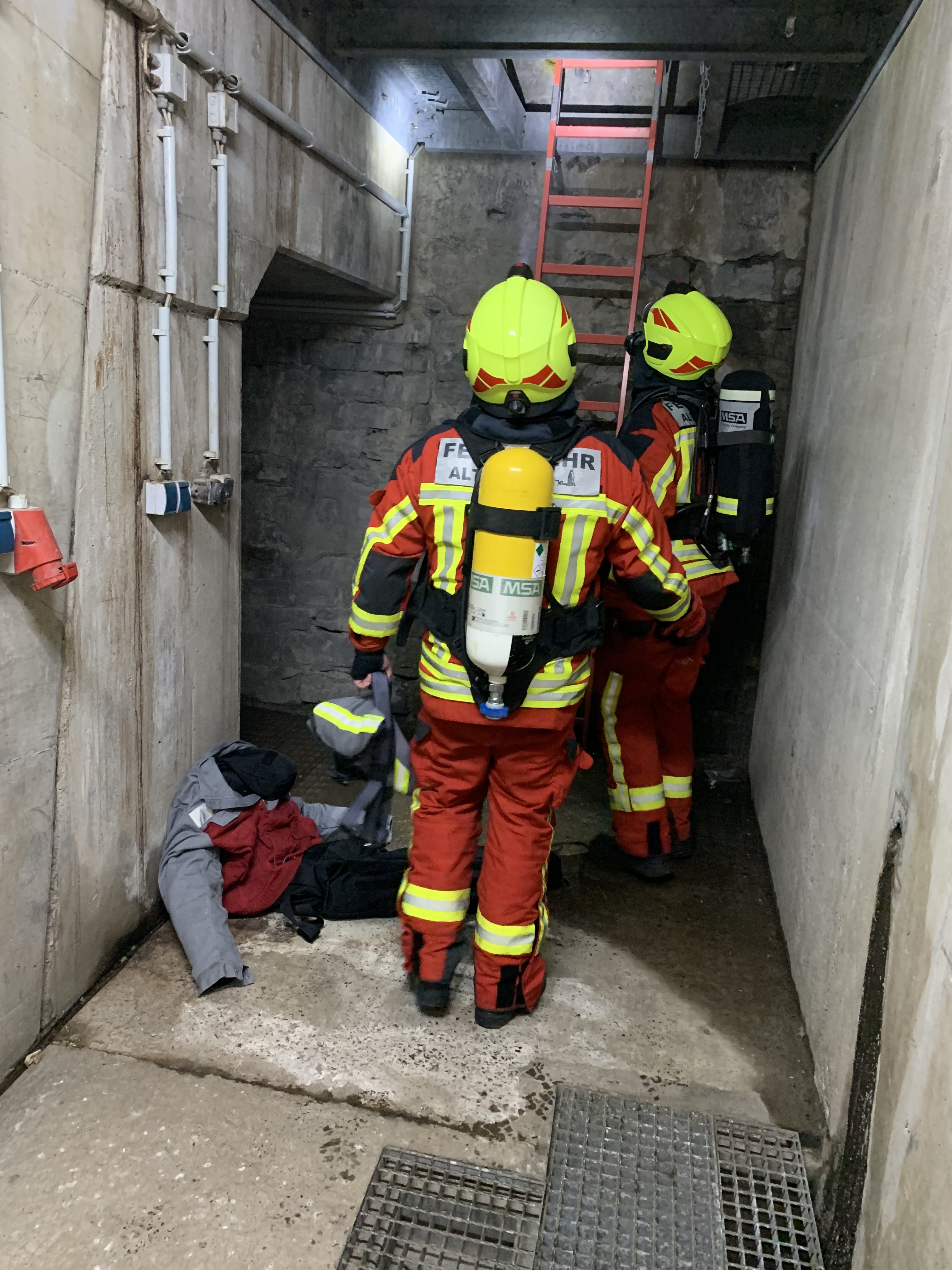 Besonders interessant: Bei dieser Übung des Löschzuges 3 am vergangenen Freitag, dem 27. September 2019, wurde nicht nur das Vorgehen der Einsatzkräfte unter Atemschutz geübt, sondern auch der vor einigen Jahren neu eingeführte Digitalfunk vor eine Belastungsprobe gestellt. Da der herkömmliche Analogfunk durch die dicken Wände der Staumauer größtenteils abgeschirmt wird, wurde im Fuße der Mauer ein Digitalfunkgerät als sogenannter „Repeater“ eingesetzt. Durch dieses Gerät wurde das Signal der Funkgeräte der vorgehenden Atemschutztrupps verstärkt, sodass die Kommunikation mit den Einheitsführern vor der Staumauer deutlich verbessert wurde. Ein solches Vorgehen ist auch bei Einsätzen in Tiefgaragen oder Stollen, wie dem Zugang zum Burgaufzug, denkbar.